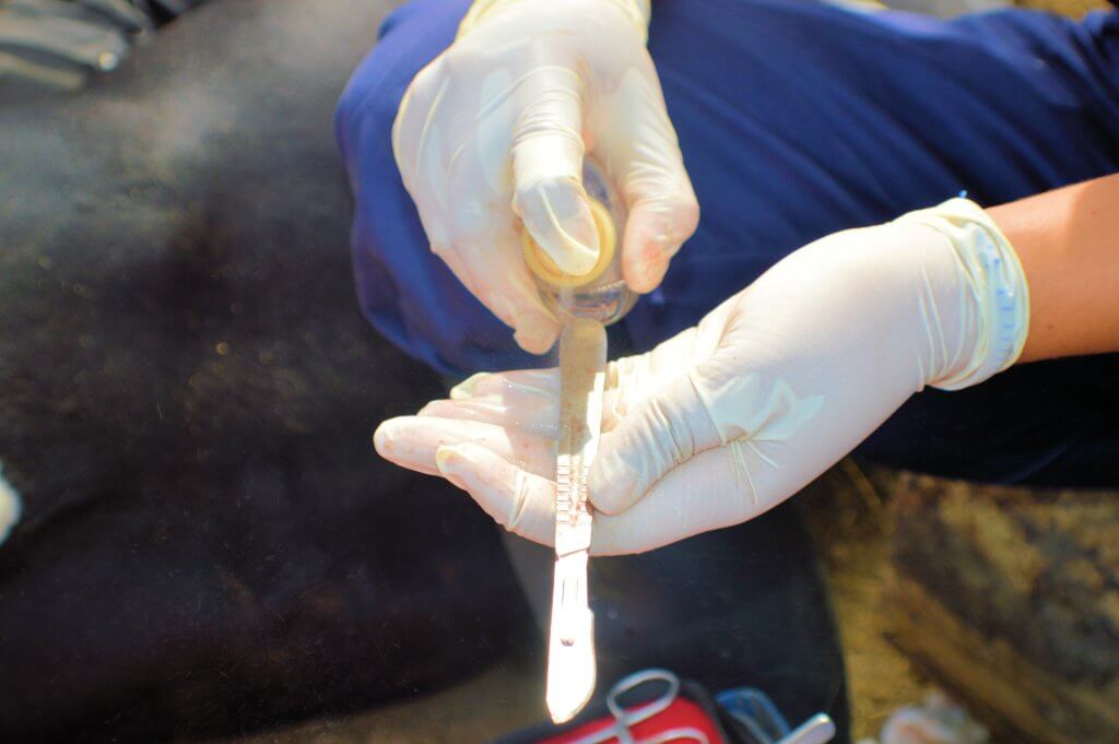 Atención a casos especiales: Revisión clínica de una yegua con lesión abierta en el miembro anterior izquierdo, toma de muestras de sangre y heces para análisis, y diagnóstico y tratamiento de una cabra con problemas de salud. Preparación quirúrgica de 6 toros receladores. Corrección quirúrgica de Hernia umbilical: 1 becerro y 1 becerra.